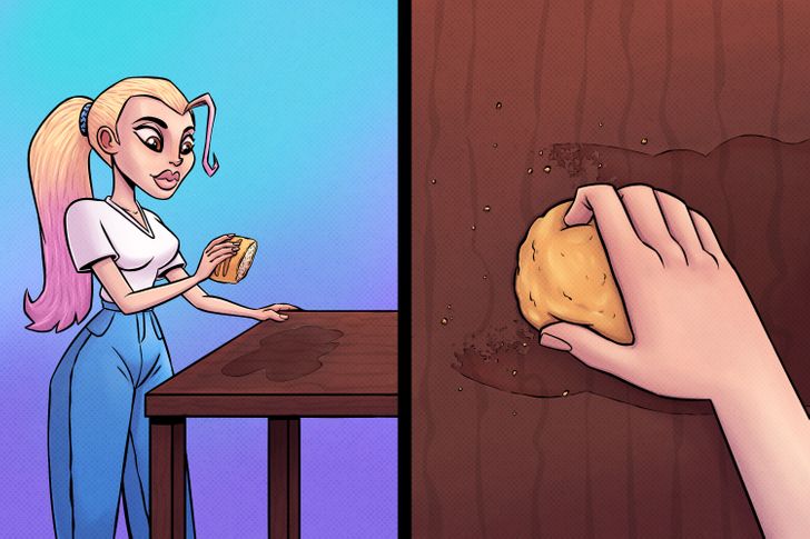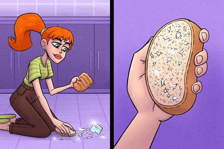 Fiber is the texture you need while trying to pick up teensy-weensy pieces like smashed glass, and bread has this texture. Use the soft part of the bread like a cotton ball and clean the accident area by pressing it on the surface.