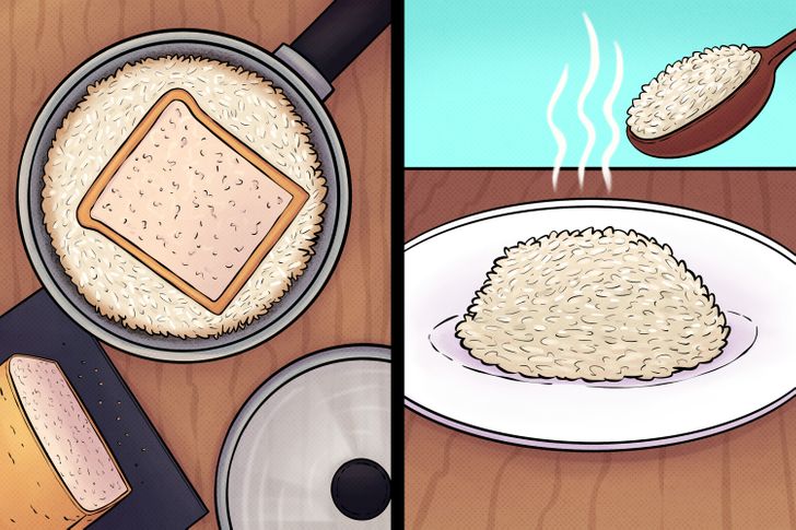 If the rice is burnt, don’t throw it away. Just get rid of the problematic part first and place a slice of bread on top of the remainder to remove the smell. Nobody will notice!