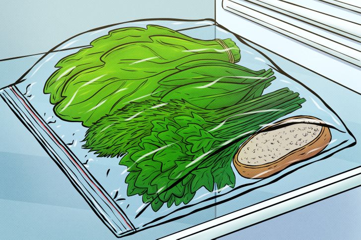 Remember the humidity factor from the previous point. It also affects your green leafy vegetables, even if they’re in the fridge. After drying the greens, place a slice of bread in the container you keep them in. This will prevent them from going bad fast, which also eliminates the risk of a possible rotten smell.