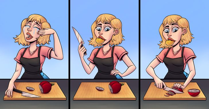 This may look funny, but it works like a charm! Put a piece of stale bread in your mouth, leaving a little portion outside of your lips. The reason that you cry when cutting onions is because of the sulfates that are released while cutting. The bread absorbs the gas and creates tear-free air for you.