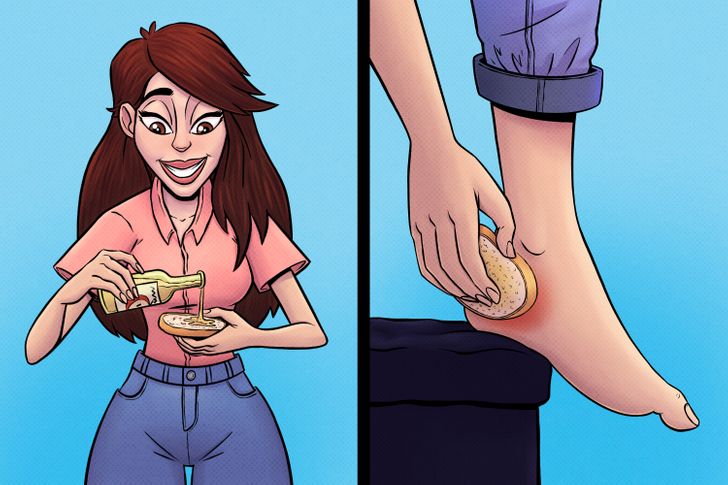 When it comes to a natural foot treatment, apple cider vinegar and bread can create miracles together. Vinegar’s acidic properties help moisten dried and cracked skin. Meanwhile, bread’s porous structure will stay damp longer when compared to cotton or a regular cloth. Leave it overnight, covering your feet with plastic bags and socks. You’ll wake up with softer skin on your heels.