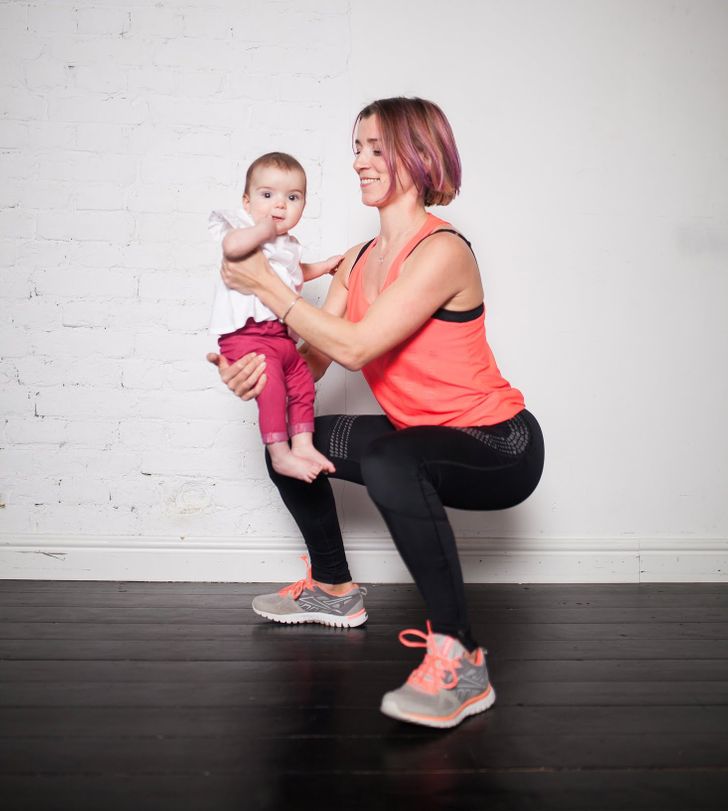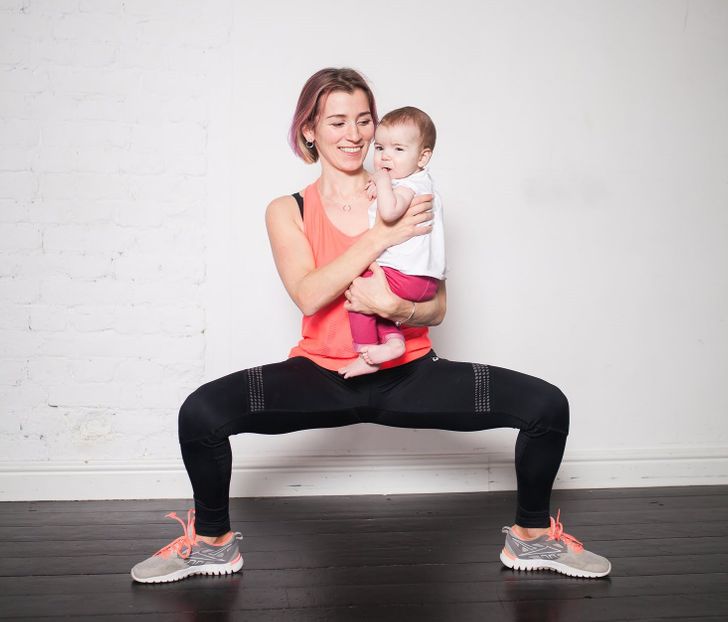 Stand with your feet more than shoulder-width apart. Hold your baby in front of you. Bend your knees as far as possible until they make a 90° angle. Hold this pose for 2–3 minutes, and then return to standing.