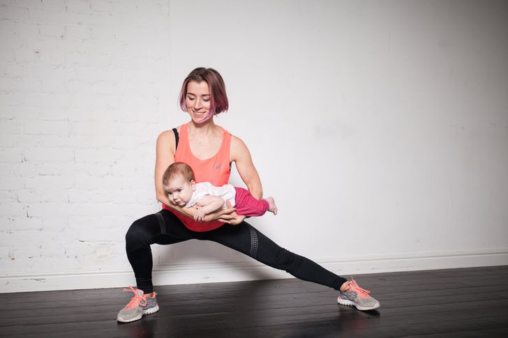 Stand with your feet wide apart, and hold your baby close to your belly. Take a large step forward with your right leg, and lower your body until your knee forms a 90° angle. Switch legs, and repeat the exercise.